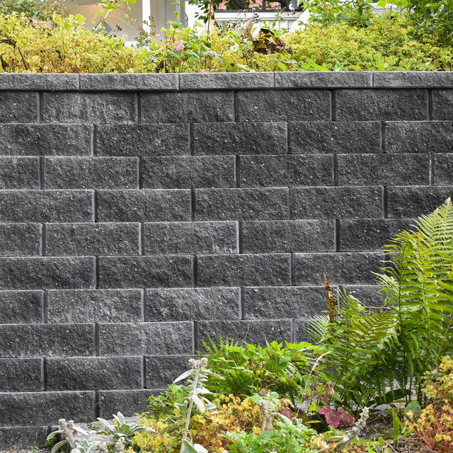 Fargen Grafitt er en mørk naturstein som skaper kontrast og gir støttemuren et stilrent uttrykk. Den mørke nyansen passer spesielt godt til lyse hus, ettersom kontrasten blir mer fremtredende.