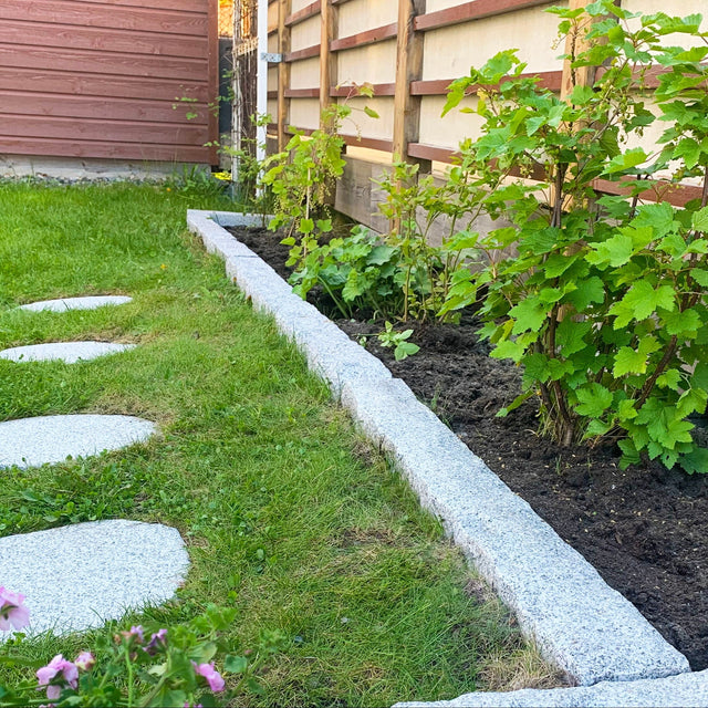 En populær løsning er å montere steinen som en kantstein mot en plen. Da legger du den i nivå med gresset, slik at du enkelt kan klippe plenen uten å bekymre deg for ujevnheter. Ved klipping kan du kjøre det ene hjulet på gressklipperen over steinen, men pass på at du ikke går for nær, slik at du ikke skader klippebladene. En kantstein i granitt gir en pen ramme og et stilrent uttrykk.