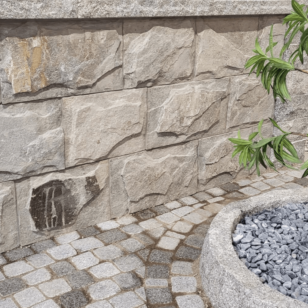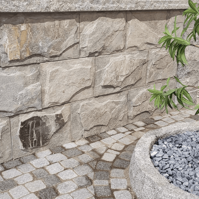 Forblendingssteinen har en råhugget overflate, noe som gir et naturlig utseende til både murer og grunnmurer.